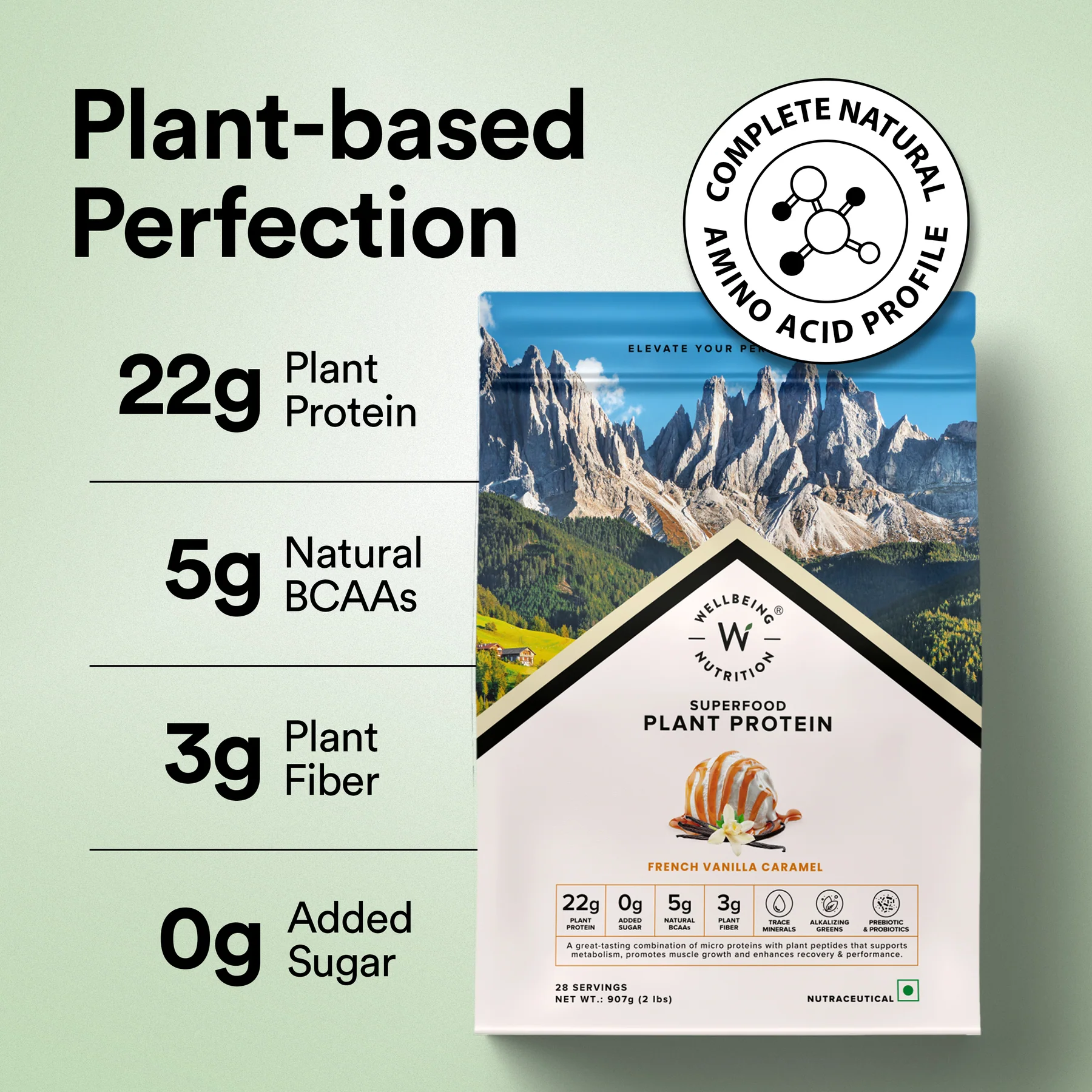 Our premium vegan protein powder, a delicious blend of French Vanilla Caramel flavour, is meticulously crafted to fuel your active lifestyle. Packed with 22g of plant-based protein per serving, it’s the perfect balance of multi-source protein for muscle recovery, weight management, and lasting energy. Infused with alkalizing super greens, trace minerals, digestive enzymes, along with prebiotic and probiotics, our expertly curated protein delivers clean, complete nutrition in every scoop for your body to perform at its best.
